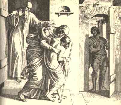 Then she went in, and fell at his feet, and bowed herself to the ground, and took up her son, and went out.