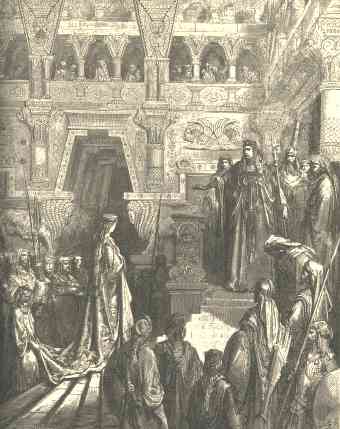 4 | And the meat of his table, and the sitting of his servants, and the attendance of his ministers, and their apparel; his cupbearers also, and their apparel; and his ascent by which he went up into the house of the LORD; there was no more spirit in her. |